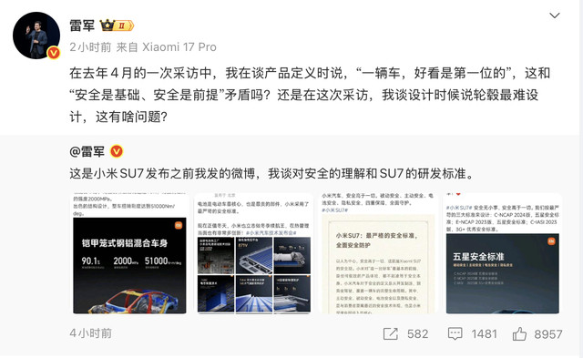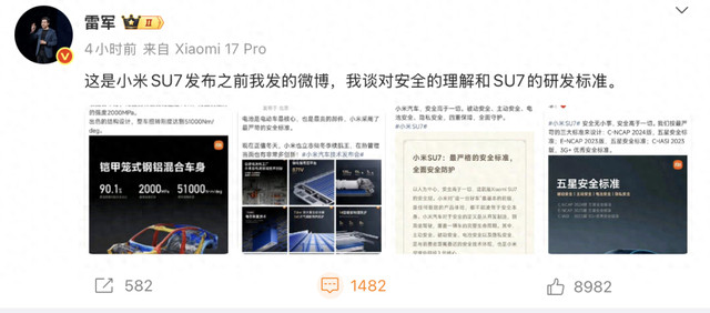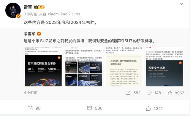 在微博中,附上他于2023年和2024年发布的四则微博截图,称“这是小米SU7发布之前我发的微博,我谈对安全的理解和SU7的研发标准。”