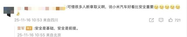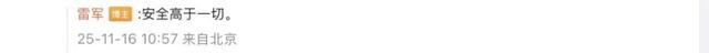 11月16日,小米汽车雷军连发多条微博,重申小米汽车的安全设计理念;有网友断章取义,说小米汽车好看比安全重要,雷军回应称:安全是基础,安全是前提,安全高于一切。